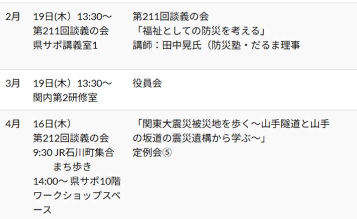 5月15日に開催された今年度の総会では、以下の重要な議題が承認されましたので、速報としてご報告いたします。 防災まちづくり談義の会の活動強化 年6回の談義の会講師が確定し、さらに充実した内容で地域防災への貢献を進めてまい […] - 年間活動計画